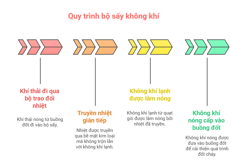 Nguyên lý hoạt động của bộ sấy không khí dựa trên sự trao đổi nhiệt giữa khí thải nóng và dòng không khí lạnh, qua đó tận dụng nhiệt thừa và tăng hiệu suất đốt.
