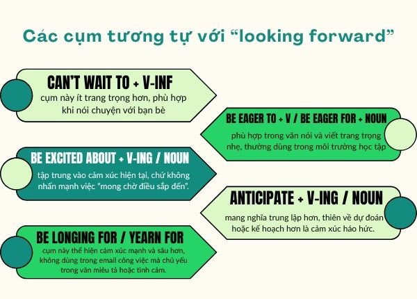 Như vậy, tùy thời điểm và ngữ cảnh, “looking forward” có thể diễn tả mong đợi trong hiện tại, đã từng mong đợi trong quá khứ, hoặc sẽ mong đợi trong tương lai.