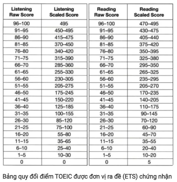 Sau khi bạn hoàn thành bài thi, số câu trả lời đúng sẽ được quy đổi sang thang điểm 5 – 495. ETS không công bố bảng quy đổi cố định, nhưng theo kinh nghiệm từ các trung tâm luyện thi: