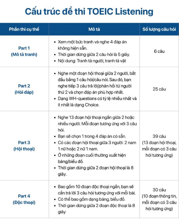 Phần Listening TOEIC kéo dài khoảng 45 phút với 100 câu chia thành 4 phần nhỏ: