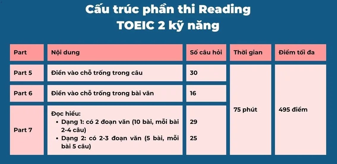 Đọc hiểu (Reading Comprehension): gồm các đoạn văn ngắn và dài, kiểm tra khả năng đọc nhanh, hiểu ý chính và chi tiết.