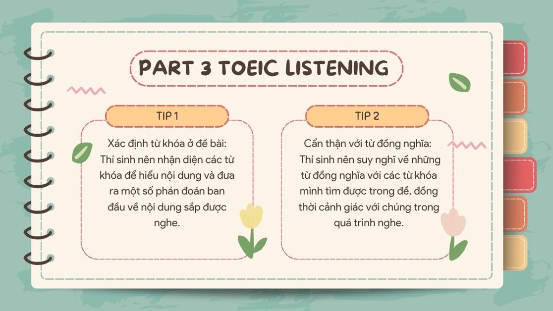 Luyện đề thật định kỳ: Mỗi tuần nên làm ít nhất 1–2 bài nghe Part 3 trong bộ TOEIC ETS mới nhất. Ghi chép điểm, xem lại transcript và xác định dạng câu hỏi mình thường sai để khắc phục dần.