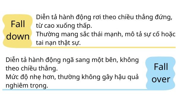 Hai cụm “fall down” và “fall over” đều nói về hành động ngã, nhưng khác nhau ở nguyên nhân, hướng ngã và mức độ. Dưới đây là cách phân biệt chi tiết để bạn dễ ghi nhớ hơn: