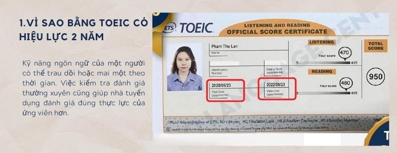 Một điều quan trọng mà nhiều người bỏ qua là chứng chỉ TOEIC chỉ có giá trị trong vòng 2 năm kể từ ngày thi. Sau thời gian này, chứng chỉ sẽ hết hiệu lực và không còn được các đơn vị tuyển dụng hoặc trường học chấp nhận.